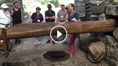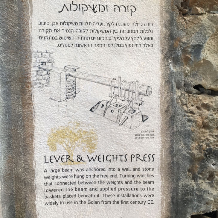After the olives were crushed, they were placed in woven baskets and stacked over a drain. The first olive oil that came out naturally from this stack was considered the very best (the “first fruit”) and so it went to the Temple. After that, heavy weights, using a long wooden beam as a lever, were placed on the olives in the baskets, and that oil was both used in the town and also sold to traders. The town produced more oil than it needed so this was a significant source of income.