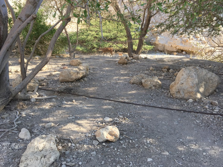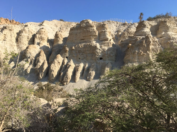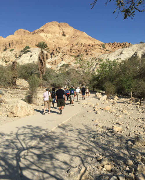 We are in En Gedi, just opposite the Dead Sea. This is a desert wadi (called Wadi David) surround by hills with caves. There is also a waterfall here that runs all year around, with fresh water that actually travels here underground all the way from Jerusalem. It is a pretty inhospitable place, as you can see as we walked into it. It is also very hot (87 degrees today) and muggy. Since it is far below sea level the air is also very thick.