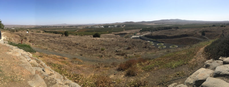 This is the view into Syria. Just below is the beginning of a plain, still in Israel (the circles near the right are in Israel). In the distance in the center is a large UN compound, and on the left is a Syrian village destroyed in the fighting. Even further in the distance on the left is a new village built to replace that one, and far over the hill is Damascus, site of the current Syrian civil war and much death.